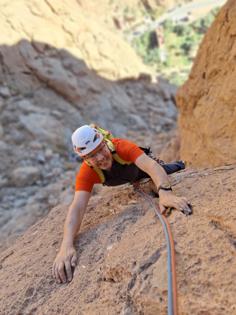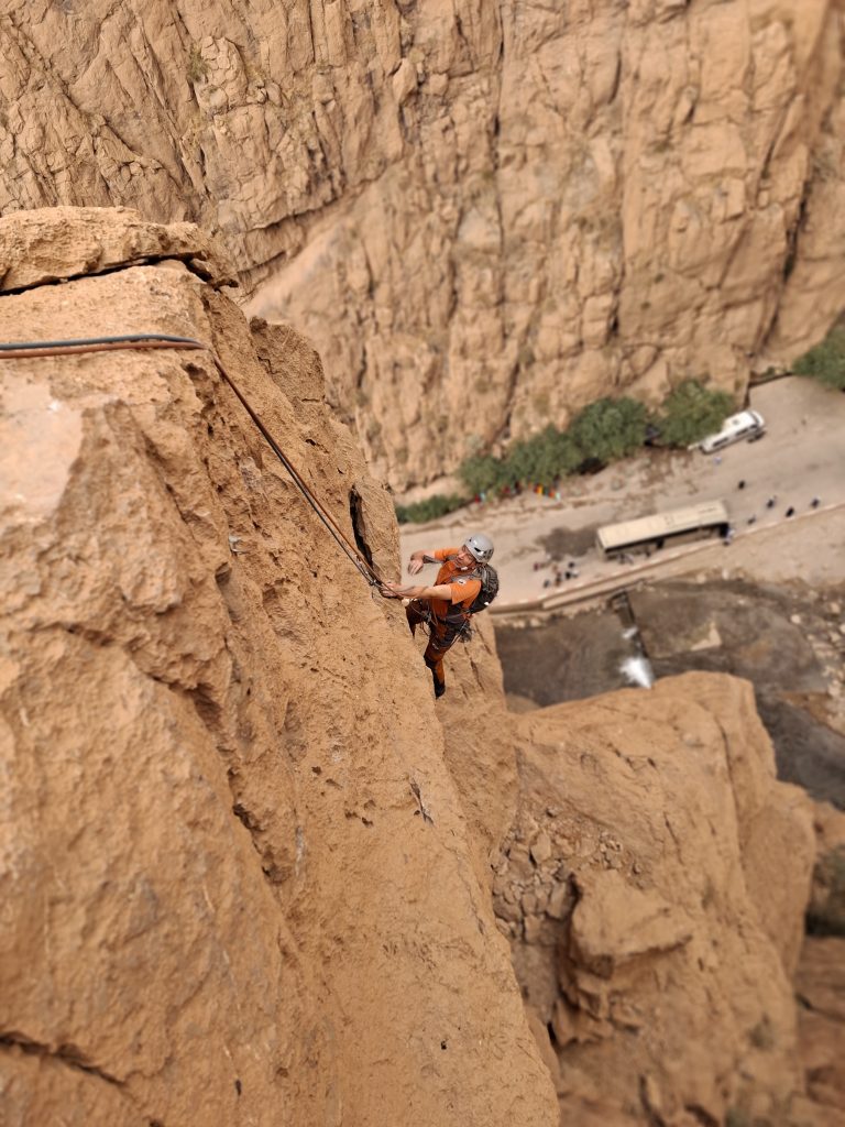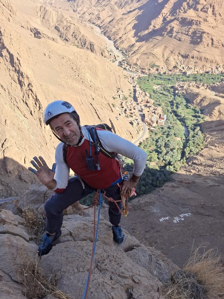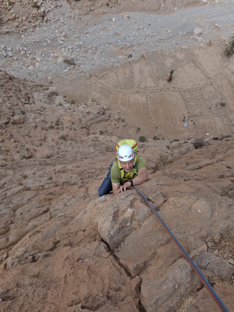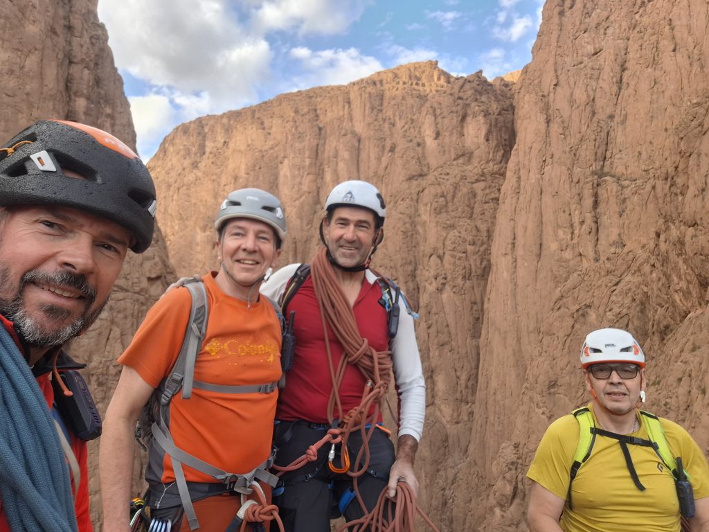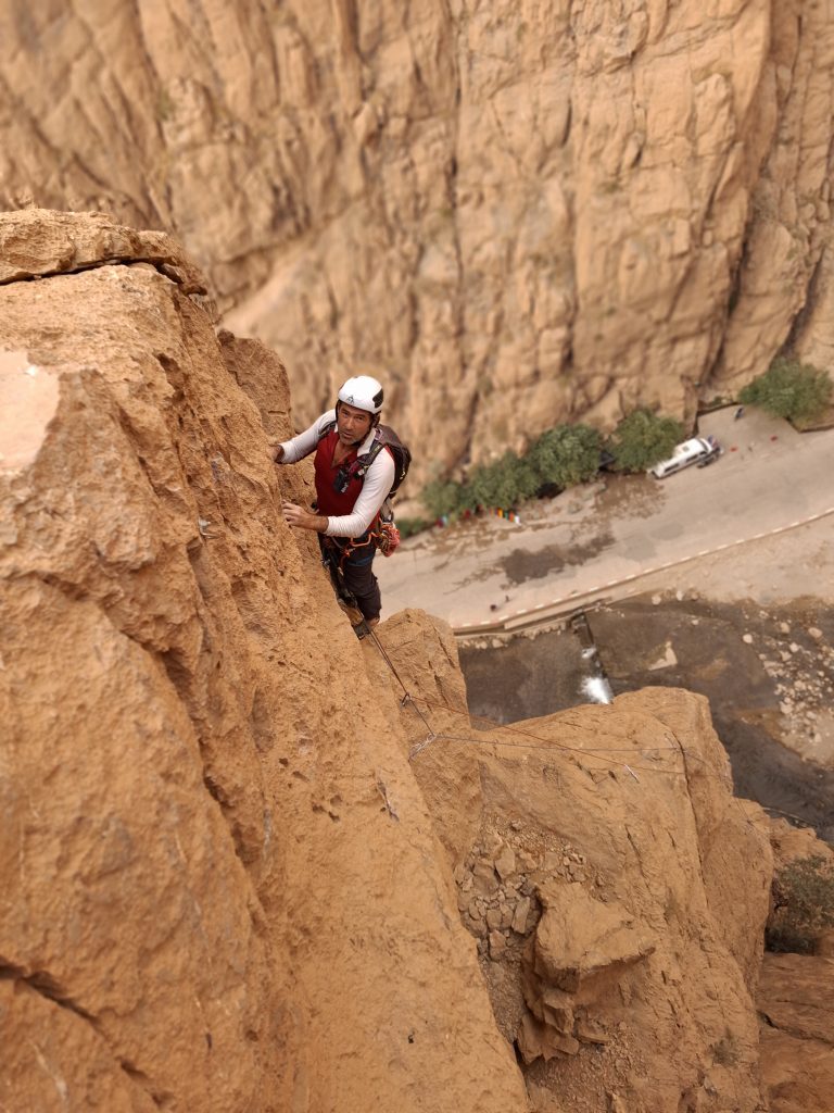 Comme chaque matin, Hakim nous conduit jusqu’aux gorges. Après une traversée périlleuse de la rivière (bravo à Serge qui a fait plouf !), nous rejoignons le départ de la voie. Nous sommes les premiers. Je commence en tête avec Didier, Serge et Pascal nous suivent. Les deux premières longueurs sont les plus soutenues (6a et 5c+), je les enchaîne d’un coup pour éviter un relais inconfortable. C’est une belle bagarre pour Didier et Serge. Serge doit gérer un mauvais tirage, alors qu’il est en tête… Puis la paroi se couche et les longueurs sont moins continues, mais toujours dans le 5b/c. Je vois que Didier commence déjà à éviter de trop tirer sur les doigts afin d’économiser « sa peau ». Avant d’attaquer l’antépénultième longueur qui présente une section plus dure, nous faisons une pause sandwich en profitant de la vue sur la palmeraie. Je grimpe cette longueur en laissant quelques petits aménagements pour Pascal qui finalement passe sans aide. La fatigue commence à se faire sentir sur l’avant-dernière longueur. Didier m’a rejoint et je me prépare à terminer la voie, quand j’aperçois Serge chuter en dessous. Il vient d’arracher un gros bloc et est retombé sur le dos. Heureusement, il n’a rien de grave, mais sa main droite est pleine de vilaines écorchures. Il finit tout de même sa longueur et nous improvisons un cabinet médical de fortune au relais. Heureusement que Serge avait également sa pharmacie de secours, car je n’avais pas assez de pansements pour toutes ses blessures. Après ce petit moment de frayeur, nous terminons la voie. Pour la descente, je décide de faire le retour à pied plutôt que la descente par le canyon que j’ai ouvert en 2023. C’est un peu plus long, mais je vois que le groupe est fatigué et je ne sais pas quel impact psychologique a pu avoir l’incident de Serge sur Pascal et Didier. En marchant, personne ne risque de faire une erreur tragique dans un rappel… Et puis, cela nous donne l’occasion de découvrir une autre partie des gorges.