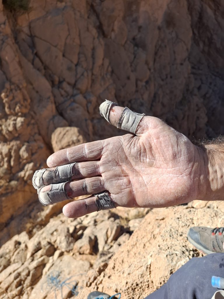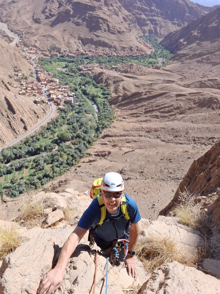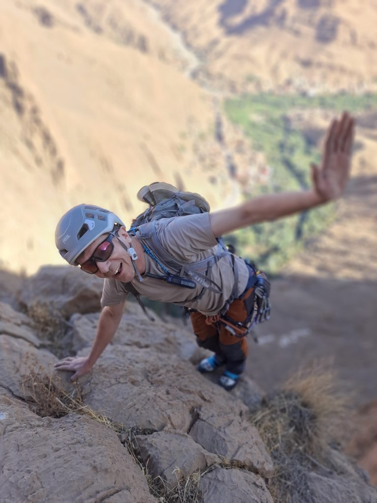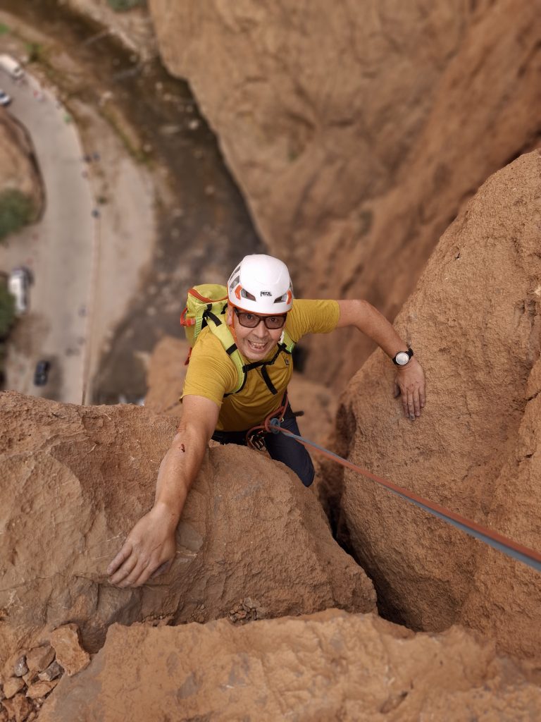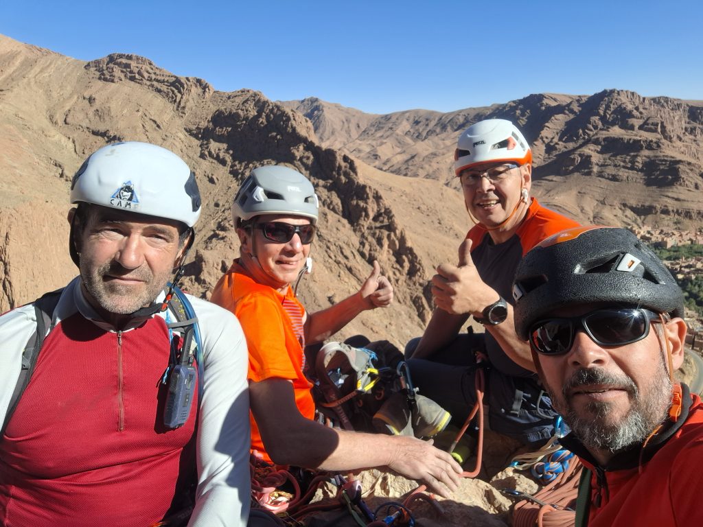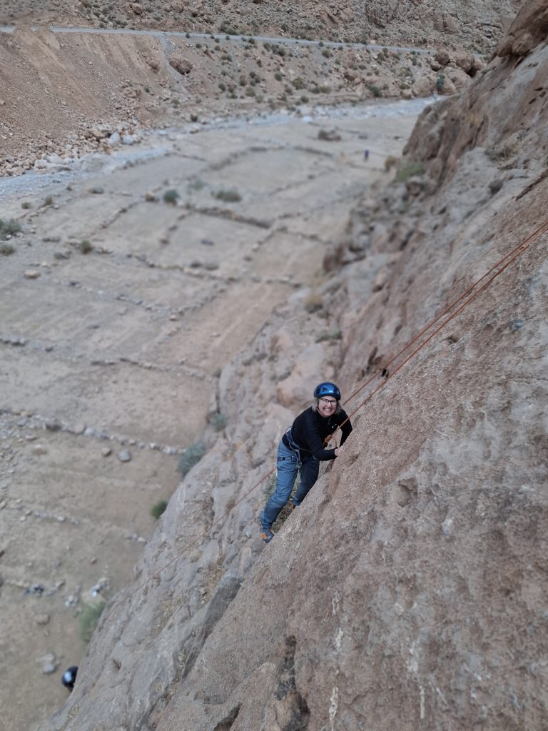 Comme chaque matin, Hakim nous conduit jusqu’aux gorges. Après une traversée périlleuse de la rivière (bravo à Serge qui a fait plouf !), nous rejoignons le départ de la voie. Nous sommes les premiers. Je commence en tête avec Didier, Serge et Pascal nous suivent. Les deux premières longueurs sont les plus soutenues (6a et 5c+), je les enchaîne d’un coup pour éviter un relais inconfortable. C’est une belle bagarre pour Didier et Serge. Serge doit gérer un mauvais tirage, alors qu’il est en tête… Puis la paroi se couche et les longueurs sont moins continues, mais toujours dans le 5b/c. Je vois que Didier commence déjà à éviter de trop tirer sur les doigts afin d’économiser « sa peau ». Avant d’attaquer l’antépénultième longueur qui présente une section plus dure, nous faisons une pause sandwich en profitant de la vue sur la palmeraie. Je grimpe cette longueur en laissant quelques petits aménagements pour Pascal qui finalement passe sans aide. La fatigue commence à se faire sentir sur l’avant-dernière longueur. Didier m’a rejoint et je me prépare à terminer la voie, quand j’aperçois Serge chuter en dessous. Il vient d’arracher un gros bloc et est retombé sur le dos. Heureusement, il n’a rien de grave, mais sa main droite est pleine de vilaines écorchures. Il finit tout de même sa longueur et nous improvisons un cabinet médical de fortune au relais. Heureusement que Serge avait également sa pharmacie de secours, car je n’avais pas assez de pansements pour toutes ses blessures. Après ce petit moment de frayeur, nous terminons la voie. Pour la descente, je décide de faire le retour à pied plutôt que la descente par le canyon que j’ai ouvert en 2023. C’est un peu plus long, mais je vois que le groupe est fatigué et je ne sais pas quel impact psychologique a pu avoir l’incident de Serge sur Pascal et Didier. En marchant, personne ne risque de faire une erreur tragique dans un rappel… Et puis, cela nous donne l’occasion de découvrir une autre partie des gorges.