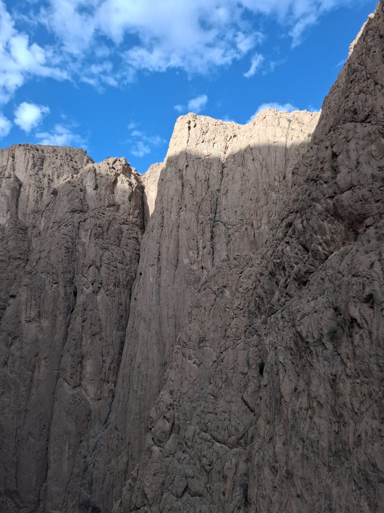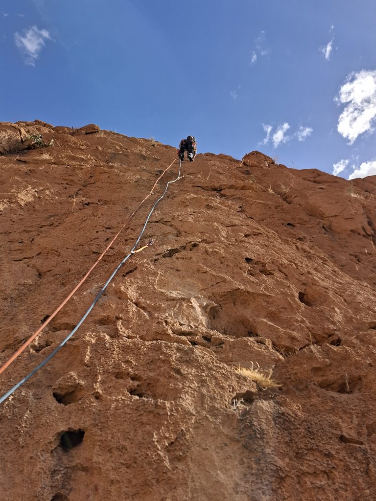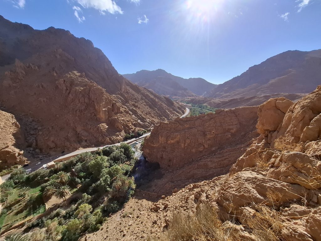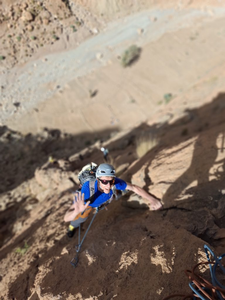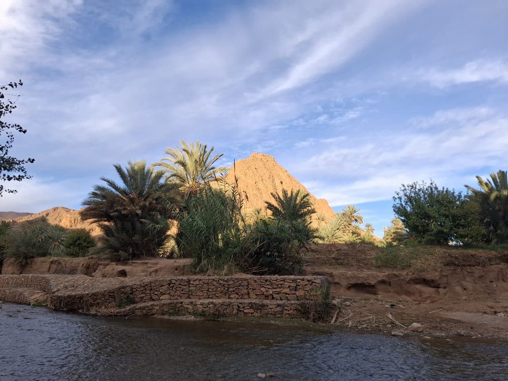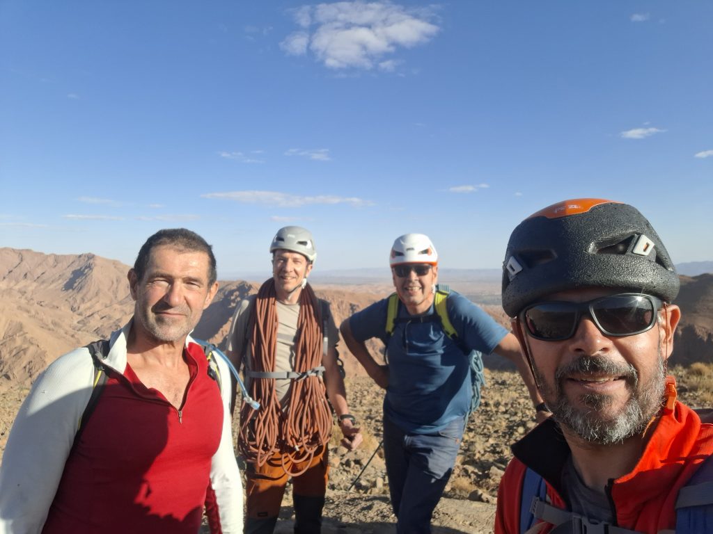 Comme chaque matin, Hakim nous conduit jusqu’aux gorges. Après une traversée périlleuse de la rivière (bravo à Serge qui a fait plouf !), nous rejoignons le départ de la voie. Nous sommes les premiers. Je commence en tête avec Didier, Serge et Pascal nous suivent. Les deux premières longueurs sont les plus soutenues (6a et 5c+), je les enchaîne d’un coup pour éviter un relais inconfortable. C’est une belle bagarre pour Didier et Serge. Serge doit gérer un mauvais tirage, alors qu’il est en tête… Puis la paroi se couche et les longueurs sont moins continues, mais toujours dans le 5b/c. Je vois que Didier commence déjà à éviter de trop tirer sur les doigts afin d’économiser « sa peau ». Avant d’attaquer l’antépénultième longueur qui présente une section plus dure, nous faisons une pause sandwich en profitant de la vue sur la palmeraie. Je grimpe cette longueur en laissant quelques petits aménagements pour Pascal qui finalement passe sans aide. La fatigue commence à se faire sentir sur l’avant-dernière longueur. Didier m’a rejoint et je me prépare à terminer la voie, quand j’aperçois Serge chuter en dessous. Il vient d’arracher un gros bloc et est retombé sur le dos. Heureusement, il n’a rien de grave, mais sa main droite est pleine de vilaines écorchures. Il finit tout de même sa longueur et nous improvisons un cabinet médical de fortune au relais. Heureusement que Serge avait également sa pharmacie de secours, car je n’avais pas assez de pansements pour toutes ses blessures. Après ce petit moment de frayeur, nous terminons la voie. Pour la descente, je décide de faire le retour à pied plutôt que la descente par le canyon que j’ai ouvert en 2023. C’est un peu plus long, mais je vois que le groupe est fatigué et je ne sais pas quel impact psychologique a pu avoir l’incident de Serge sur Pascal et Didier. En marchant, personne ne risque de faire une erreur tragique dans un rappel… Et puis, cela nous donne l’occasion de découvrir une autre partie des gorges.