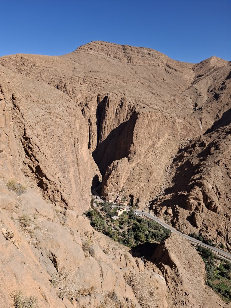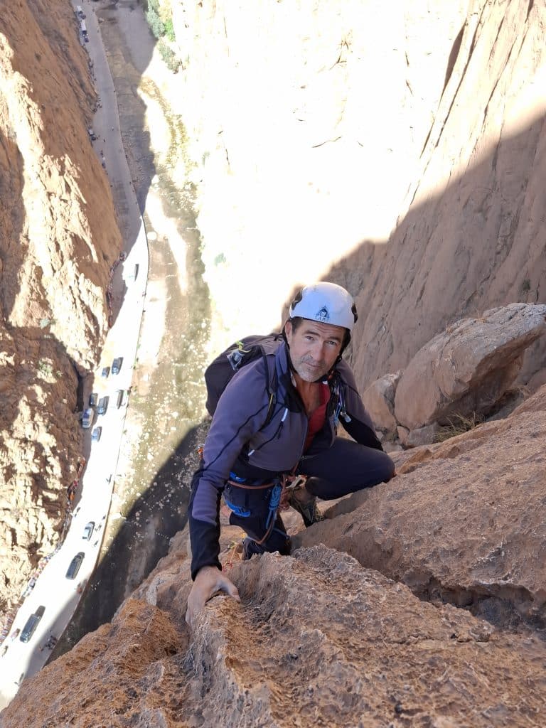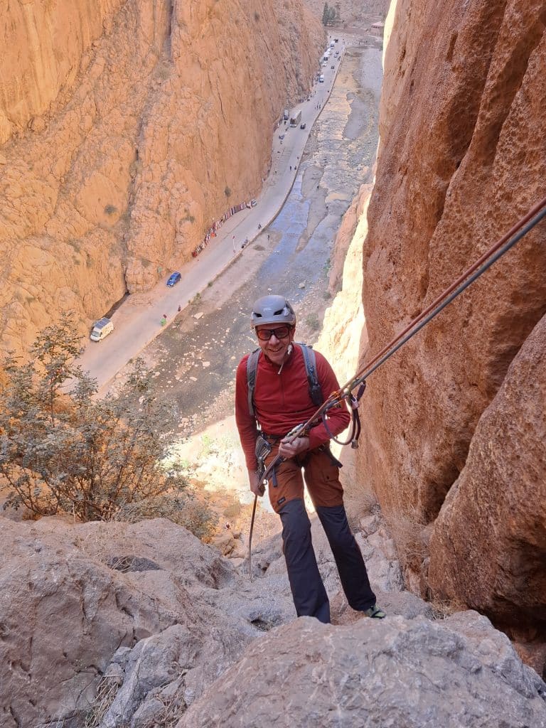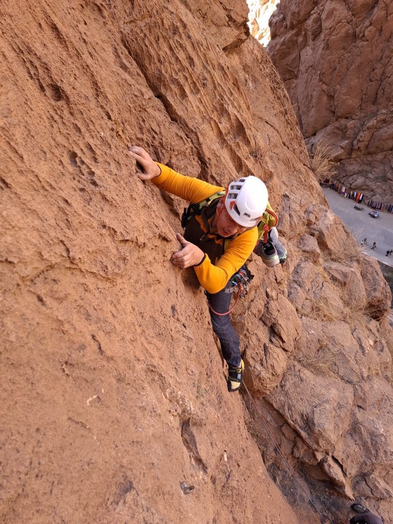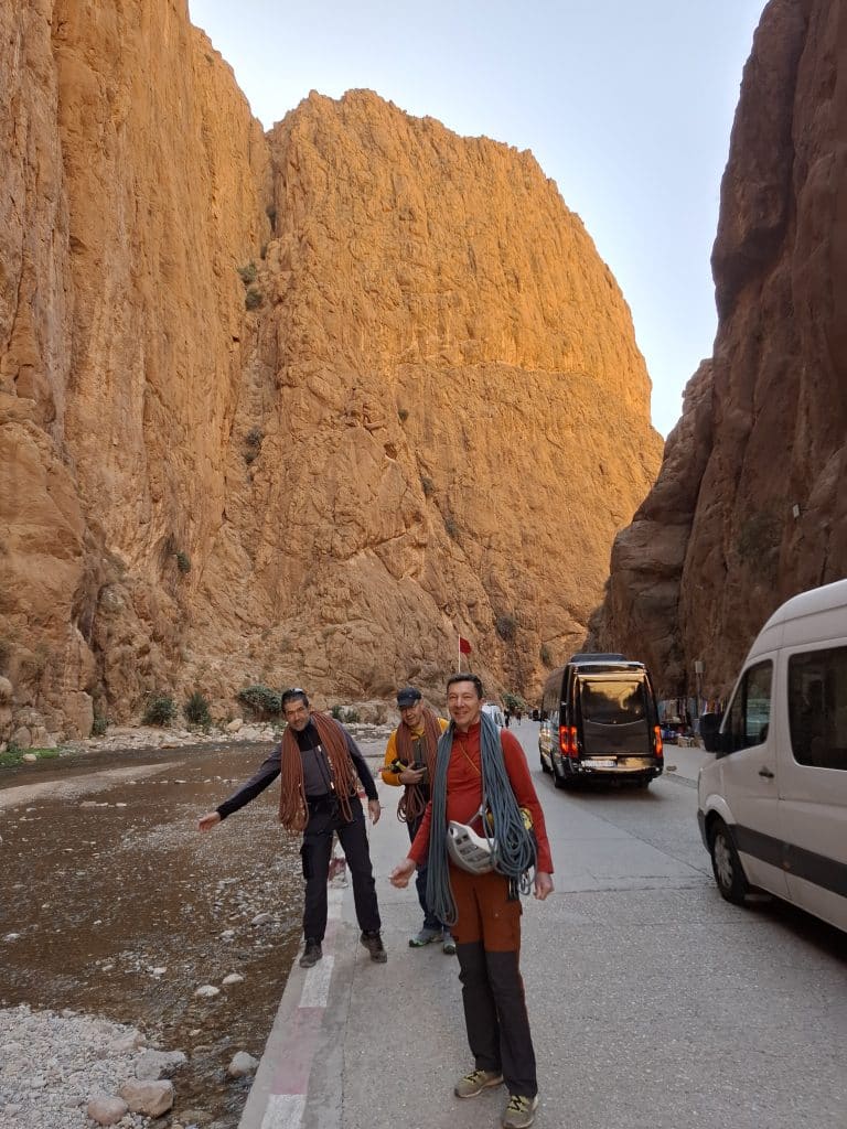 Lundi 10 novembre, Hakim nous conduit jusqu’aux gorges où nous retrouvons Madjoub, un guide de randonnée local. Il va emmener Bernadette marcher autour de la paroi du levant pendant que nous grimpons. Serge, Didier, Pascal et moi commençons par une petite promenade dans la partie principale des gorges afin de s’imprégner de son ambiance. J’en profite pour présenter les voies potentielles de la semaine. Il y a beaucoup de touristes, à pied, en moto, voiture, bus. Cette année le Maroc a déjà vu la visite de plus de 16 millions de touristes (record de fréquentation) et se hisse au treizième rang des pays les plus visités au monde en 2025. Je suis bien content pour les Marocains, car ils sont très attachants et accueillants, et ce record est bien mérité.