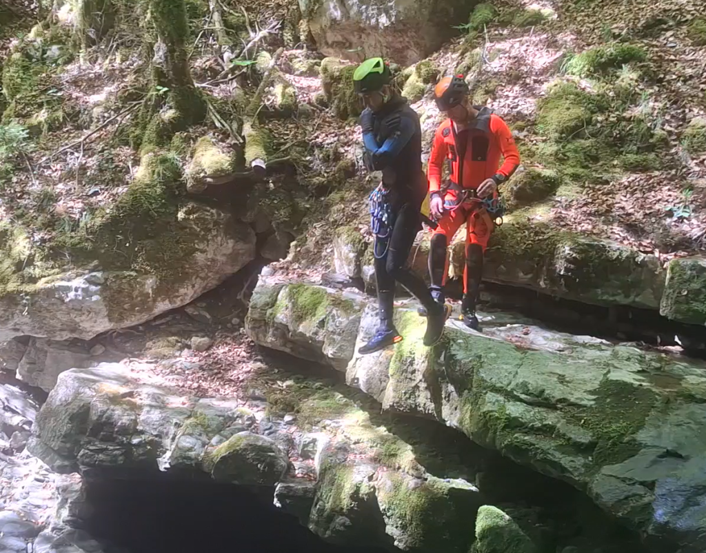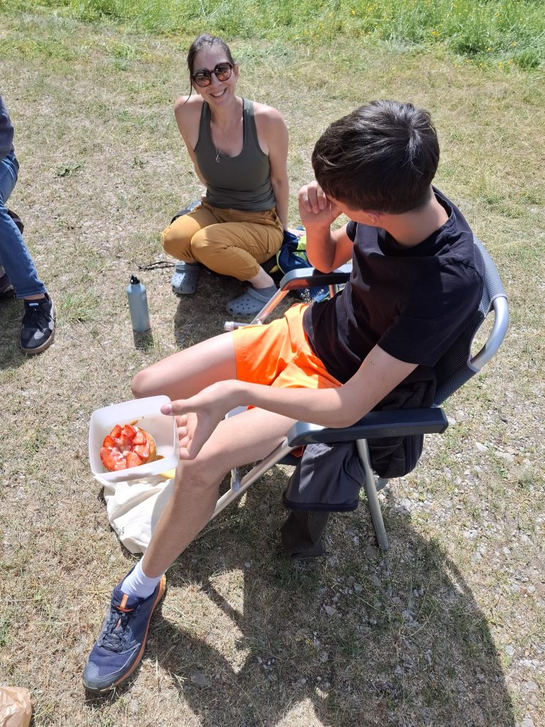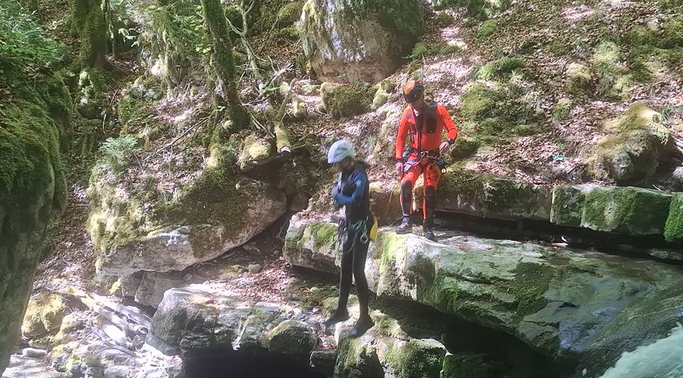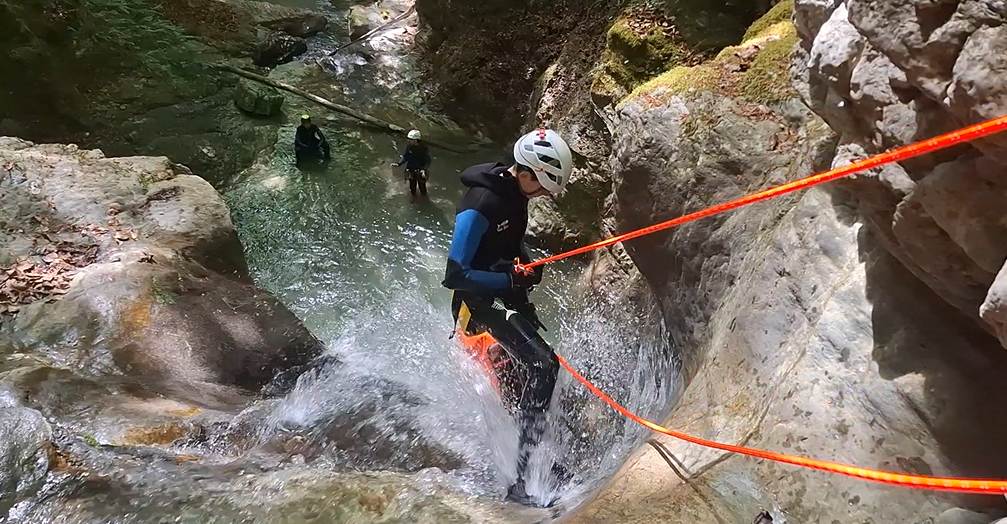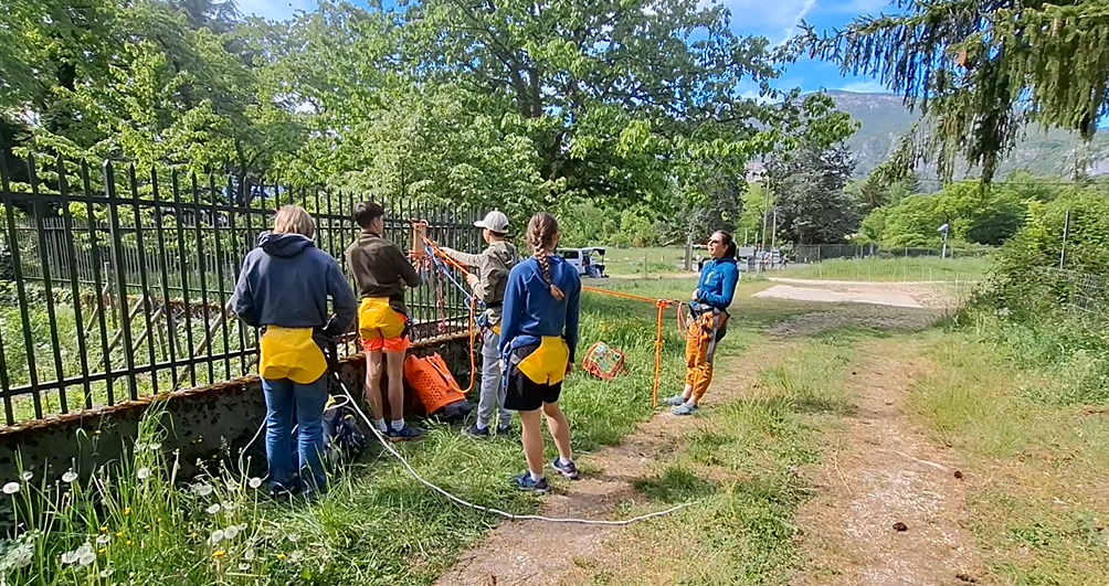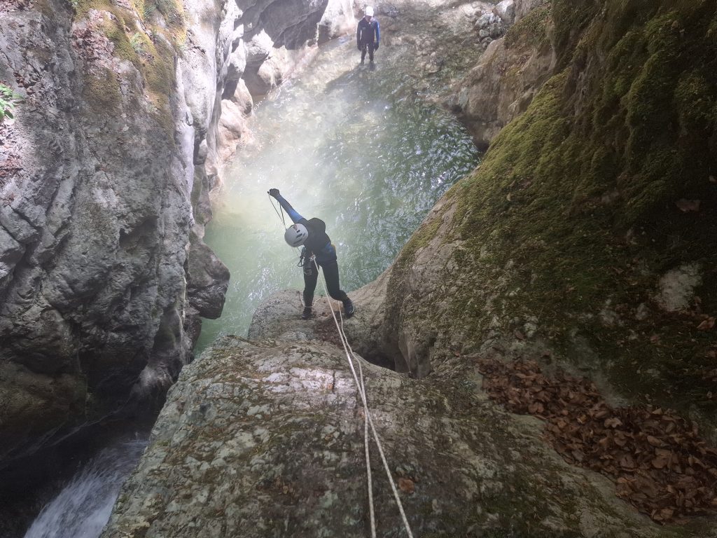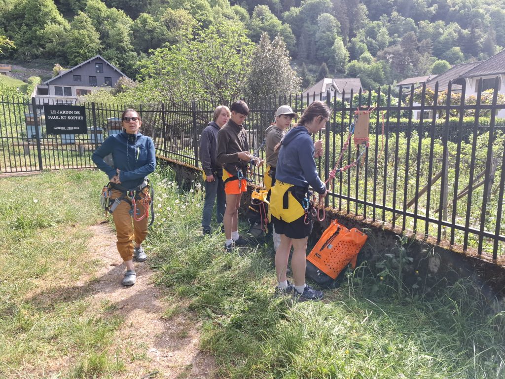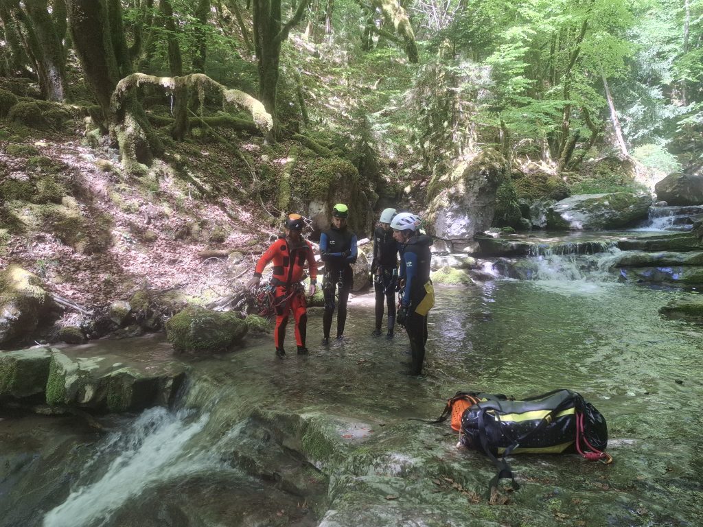 Sur le parking du canyon, nous commençons par un peu de théorie sur la pratique du canyoning : comment communiquer, se déplacer, sauter, descendre un tobogan et évoquer les dangers associés. Puis, nous passons à des ateliers pratiques pour apprendre à installer un rappel débrayable de haut, descendre en rappel en mode canyoning, débrayer et descendre en mode leader (sans oublier son sac au relais !). Cette introduction occupe la matinée jusqu’à l’heure du pique-nique, où l’on découvre que certains ont une notion très sophistiquée de l’aventure : petite tartelette aux fraises en guise de désert, ça ne rigole pas !