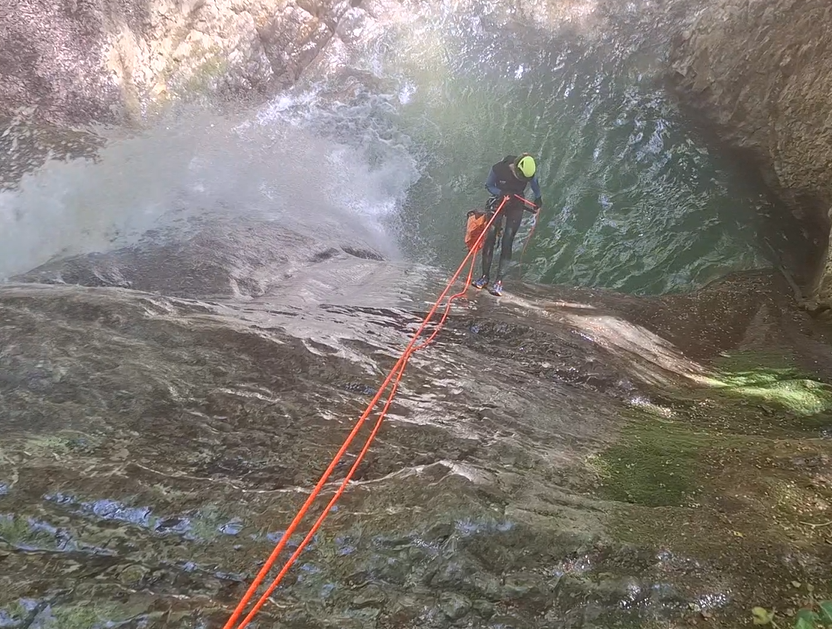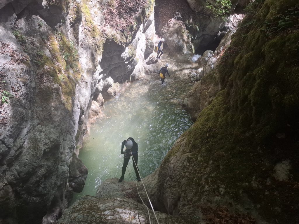 Nous continuons pour atteindre la première cascade où Oscar et Candide gèrent à tour de rôle une moitié du groupe. Puis, après un petit tobogan, nous atteignons la grande cascade de 35m, où Robin gère tout le groupe.
