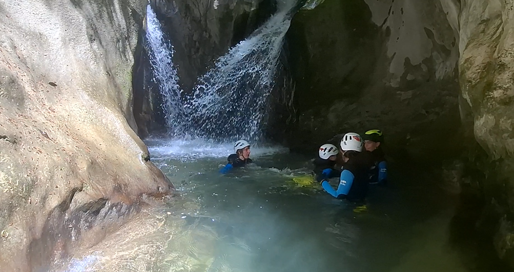 Après une séance de catch pour tester les combinaisons, nous partons pour 20 minutes de marche afin de rejoindre le départ. Sur place, nous sommes tout contents de pouvoir nous rafraîchir dans l’eau, car la montée a été « suante », surtout quand on perd à chifoumi et qu’il faut alors courir en combinaison de canyon dans la montée.