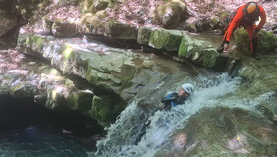 Le premier obstacle est la fameuse boite aux lettres d’Angon qui en passant sous un bloc permet d’atterrir dans une belle vasque en glissant dans un tobogan. Lorraine va sonder la vasque pour que nous puissions passer en sécurité. Après une courte marche, nous arrivons à une autre vasque où il est possible de descendre un petit tobogan et de faire nos premiers sauts. Cette fois, c’est moi qui sonde la vasque (Brrrhhh, c’est froid…).