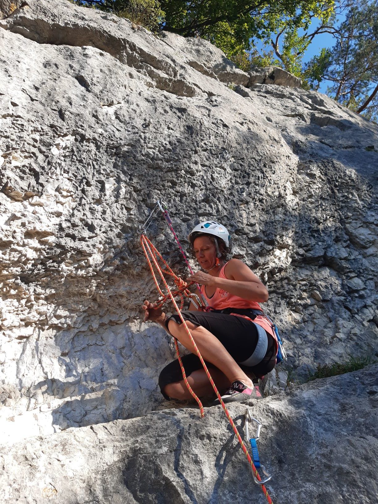 Ce cycle d’initiation s’est déroulé sur six séances. L’objectif était d’accompagner les participants vers une pratique autonome sur des sites d’école d’escalade : préparer une sortie, grimper en tête, effectuer la manœuvre de haut de voie, et aborder des notions de réchappe et descente en rappel. Ils ont également découvert différentes manœuvres de secours qui sont abordées dans la formation d’un initiateur SNE, mais le programme prévu par le moniteur était un peu trop ambitieux pour permettre à chacun d’intégrer toutes ces notions en si peu de séances. Toutefois, tout le monde a fait des progrès incroyables. En particulier, c’était pour moi une grande satisfaction de voir une grimpeuse débutante capable de dominer ses appréhensions sur le rocher et réussir à grimper une voie en-tête en effectuant toutes les manœuvres découvertes pendant le cycle !